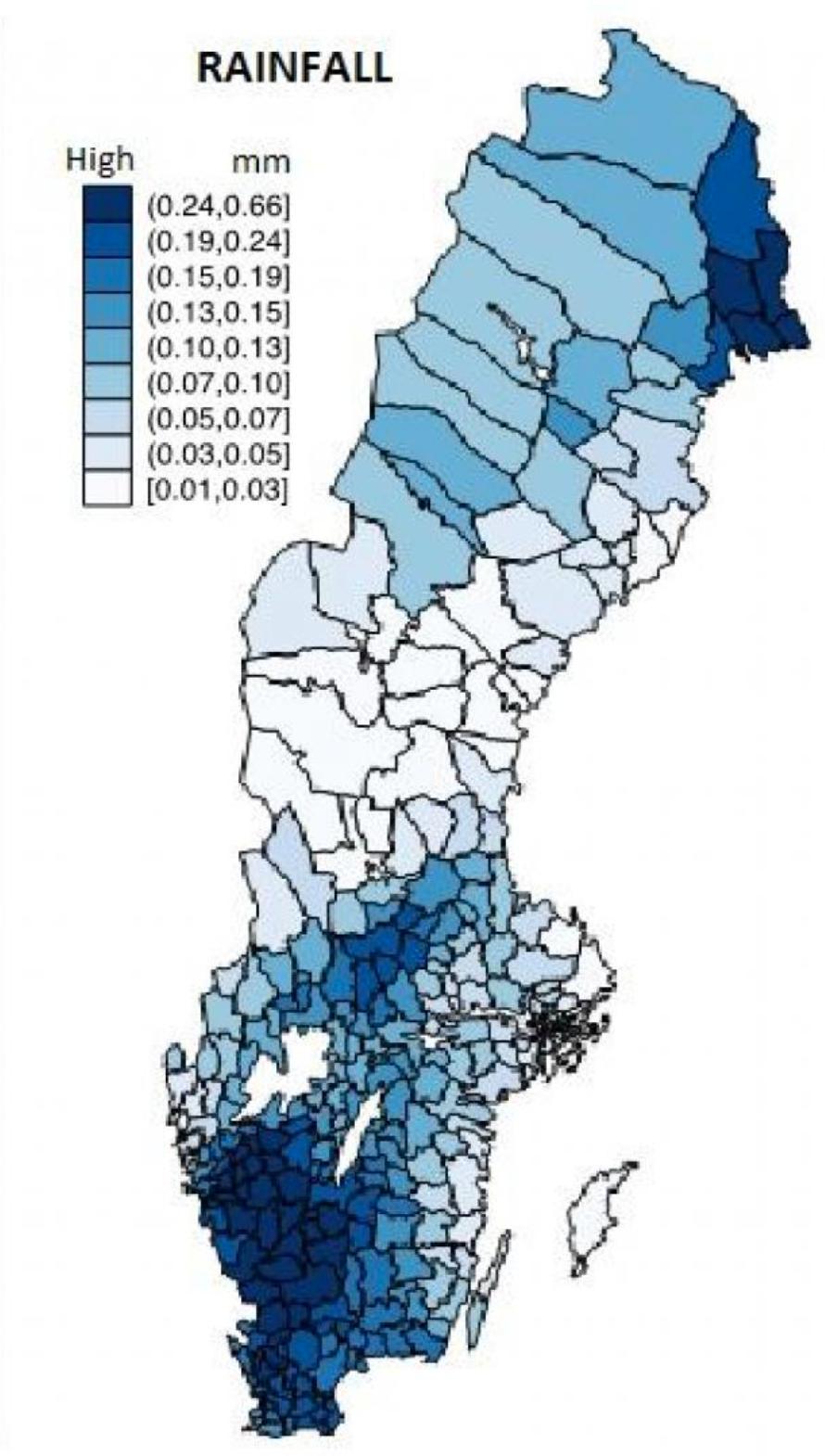 À Stockholm, il tombe environ 530 mm (21 in) de pluie ou de neige par an, les précipitations ne sont donc pas abondantes, bien qu'elles soient bien réparties au fil des mois, et connaissent un minimum au printemps et un maximum en été, comme c'est souvent le cas dans le reste de la Suède. À Malmö, il tombe 605 mm (24 in) de pluie ou de neige par an, avec un maximum en été et en automne comme le mentionne la carte des précipitations de la Suède. À Östersund, les précipitations s'élèvent à 525 mm (20,5 pouces) par an, avec un maximum en juillet et août. À Lulea, les précipitations s'élèvent à 610 mm (24 pouces) par an, avec un maximum en juillet et en août. À Kiruna, les précipitations s'élèvent à 590 mm (23 pouces) par an, avec un maximum en été. D'octobre à avril, les précipitations se produisent généralement sous forme de neige. Voici les précipitations moyennes.