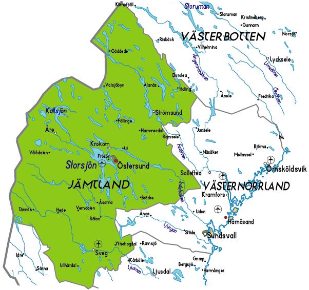 Carte de Jamtland Suède. Jamtland Suède carte (Europe du Nord - Europe) à imprimer. Jamtland Suède carte (Europe du Nord - Europe) à télécharger. Le comté de Jamtland (Jämtlands län) est un comté ou län situé au centre de la Suède, composé des provinces de Jämtland et Härjedalen, ainsi que de petites parties de Hälsingland et Ångermanland, plus deux petites bandes inhabitées de Laponie et Dalarna, comme le montre la carte de la Suède de Jamtland. Le comté de Jämtland représente 12 % de la superficie totale de la Suède, soit 49 443 km2 (19 090 mi2) et est le troisième plus grand comté du pays. La capitale du comté est Östersund et le gouverneur du comté, nommé par le gouvernement suédois, est Britt Bohlin Ohlsson, qui dirige le conseil administratif.